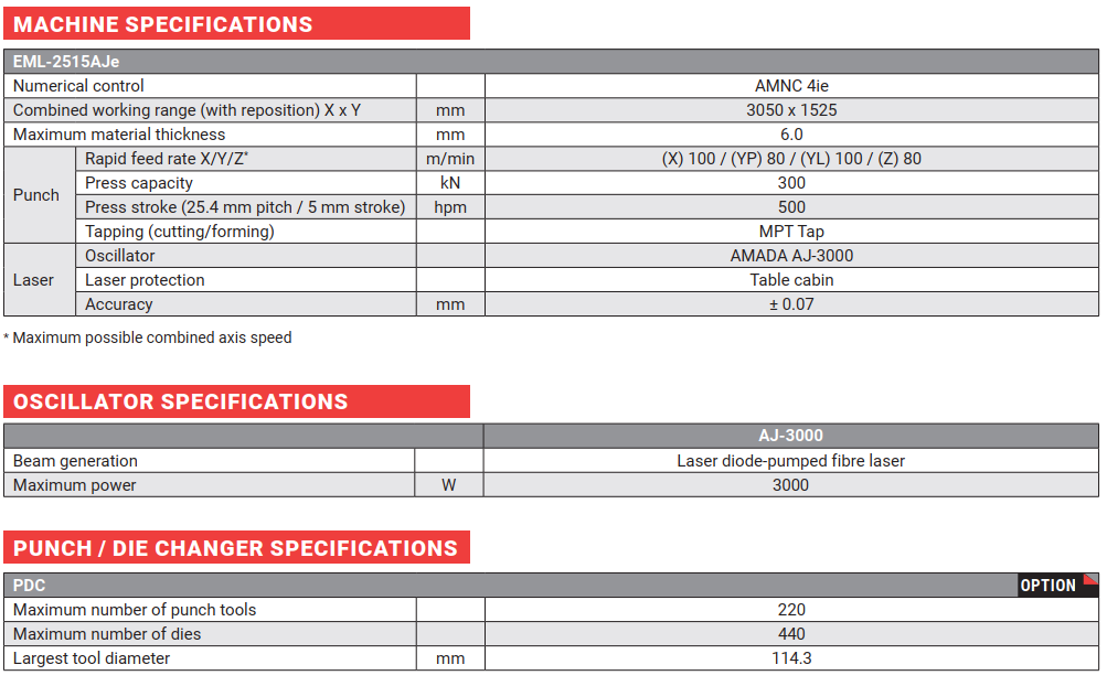 EML AJe:n ominaisuuksiin kuuluu joukko innovaatioita, jotka vähentävät koneen käyttäjän tarvetta koneen toiminnan aikana. Kuitulaser on AMADAn oma 3kW:n AJe lähde, joka leikkaa sujuvasti 6 mm:n vahvuisia materiaaleja ja lävistyksen hoitaa servomoottoritekniikka. Rakenteeltaan kone on O-runkotyyppinen ja lävistyspuolen jäysteenpoistosta on huolehdittu erityisesti. Koneessa on vakiona nouseva ja laskeva harjapöytä alarevolverin keskellä ja reunoilla, joka mahdollistaa naarmuttoman ja laadukkaan levyn alapinnan. EML-AJe hoitaa monipuoliset tehtävät yhdellä asetuksella, ja mukana mm. AMADAn P&F (Punch & Form) -mekanismi, minkä myötä 30 tonnin ylhäältä alas suuntaavan pidätyksen lisäksi tuottaa 16 tonnin iskun alhaalta ylöspäin. P&F on EML AJe:n vakio-ominaisuus, jolla voidaan valmistaa kappaleeseen enimmillään 22 mm korkeita muotoja.